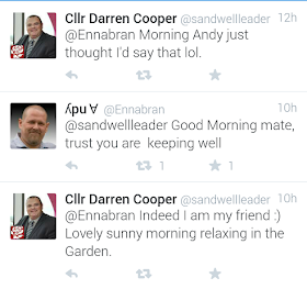 I have also pointed out to WMP that Cooper regularly uses Twitter to attack and harass others and, of course, once had his own account suspended by Twitter for bullying a private individual. But in his eyes (and, seemingly, those of WMP) there is one rule for him and another for everyone else. Thus when a Sandwell resident (ie NOT a politician) complained about Cooper's absolutely relentless harassment the Council "leader" replied on 26th May, 2014,